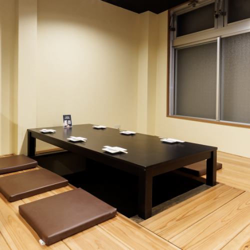 リラックスできる掘りごたつ席をご用意。落ち着いた照明が照らすシックな内装で、日常の喧騒を忘れてゆったりとお酒を嗜むのに最適な空間です。親しい方々と地酒を囲みながら親睦を深める場として、多くの方にご利用いただいております。